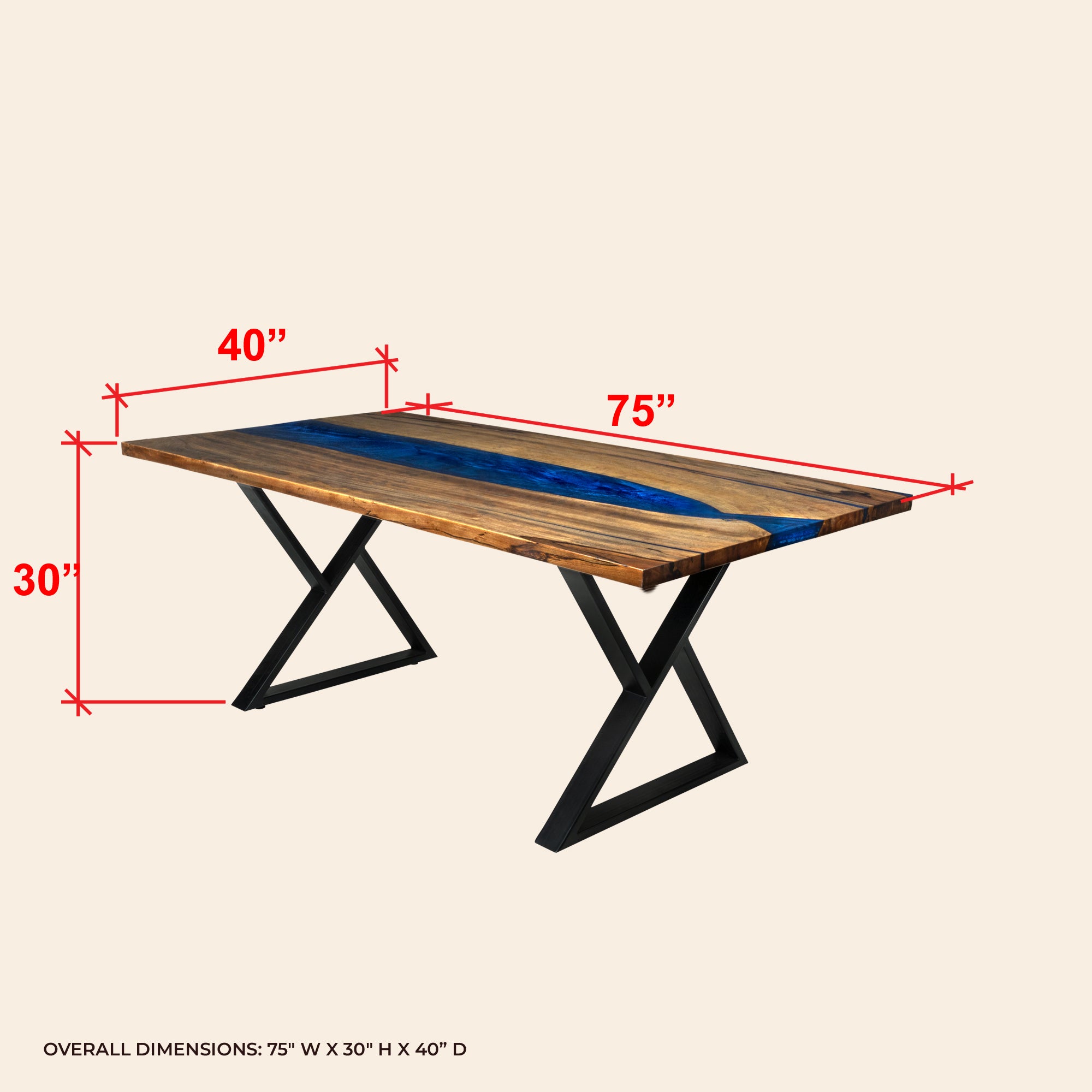 The table features a stunning resin design that adds a modern and artistic touch to the piece. The resin has been carefully mixed with various pigments and colors, including vibrant shades of blue and deep, rich black, to create two distinct options for the swirling, abstract design that complements the natural grain of the wood.